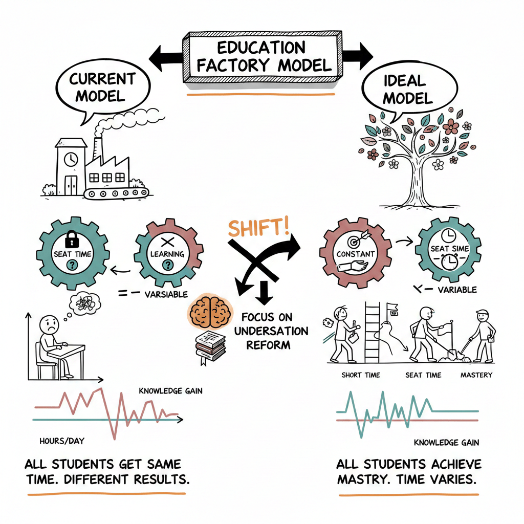 As it stands, seat time is the constant in education and learning is the variable. Alpha shows what happens when we invert the model: seat time should be the variable and learning should be the constant.